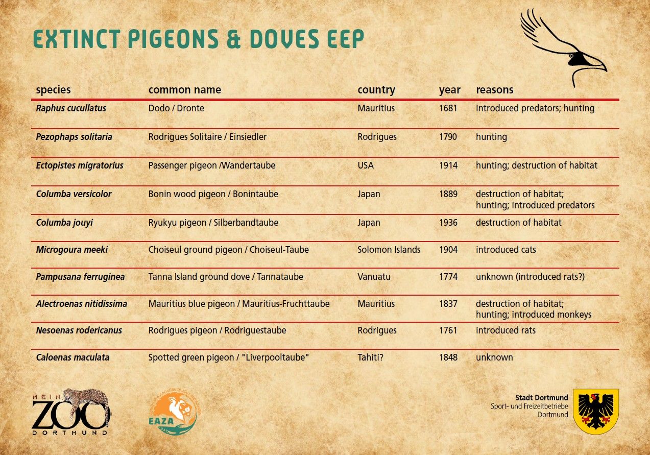 | The extinct species of the Columbiformes serve as models for how far human interaction with nature can go. Each species has its own extinction history. This comes especially clear by comparing the two most wellknown species of extinct pigeons, the dodo and the passenger pigeon. The EEP will serve as advocacy in as far as „learning from the past“ will ideally help to let this never happen again. Thus, extinct pigeons can teach us a lot about recent species on the brink of extinction like the Soccorro dove or the Tooth-billed pigeon. |